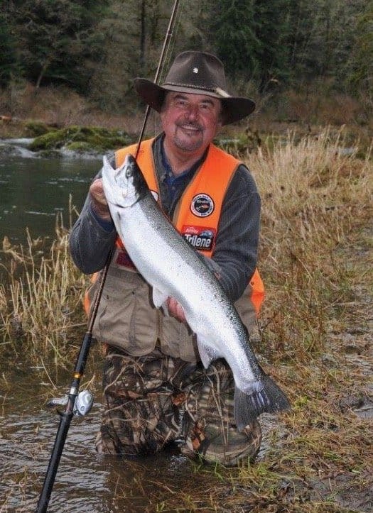 The Trask didn’t overwhelm anglers this week, but traffic was light. Icon Buzz Ramsey spent some time at the Dam Hole last week however, and had lots of opportunities over this extended weekend. Fishing from the bank (I don’t think he spent every day on the Trask), he put 16 steelhead to the bank, the Buzz Ramsey way! Here’s one of his hatchery beautes: